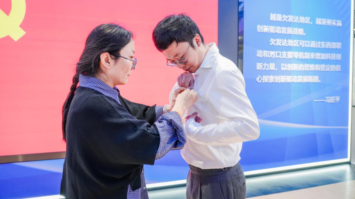 庄严的预备党员宣誓环节成为活动亮点,将红色基因传承与党员使命教育深度融合。伴随着激昂的《国际歌》旋律,全体人员起立致敬,在肃穆氛围中,新发展预备党员面向党旗举起右拳,以铿锵誓言许下“为共产主义奋斗终身”的承诺;支部书记为预备党员佩戴党员徽章,小小的徽章不仅是党员身份的象征,更承载着“赓续红色血脉、勇担科技使命”的期许,勉励新党员以先烈为榜样,将爱国情、强国志融入科技工作日常,同时号召全体党员以 “老带新、传帮带” 形式,在科研攻关与管理服务中凝聚支部合力。